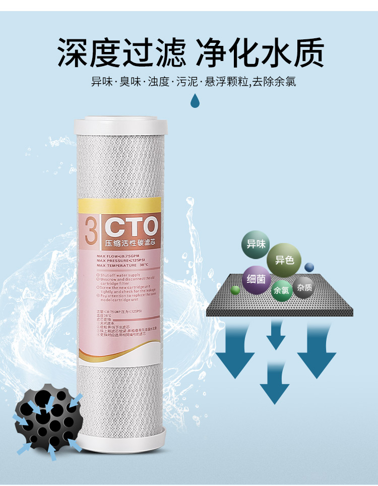 10寸平口第三级精密烧结压缩活性炭果壳网碳滤芯净水器纯水机CTO