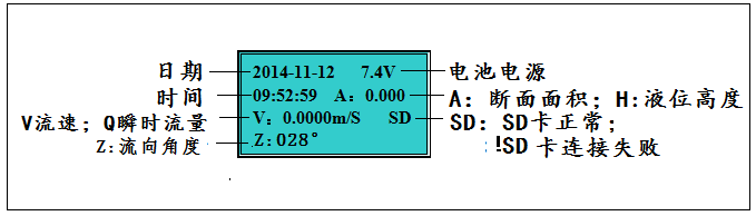 第三行显示:V和Q循环显示;V测量的当前流速,单位米/
