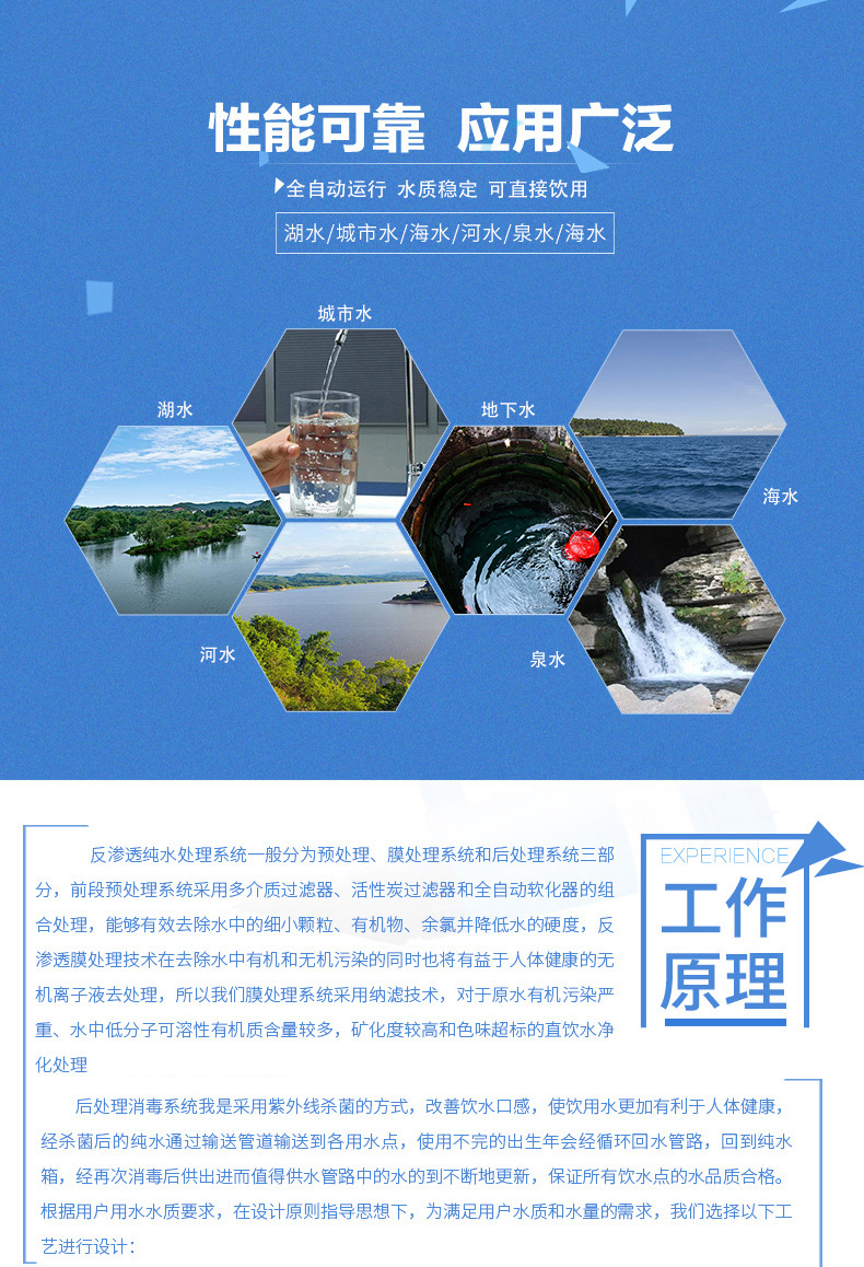 1、预处理由石英砂过滤器、活性碳过滤器、全自动软水器、精密过滤器组成(我司采用全自动控制阀头),也可选用超滤系统作为预处理,但通常工程造价要高。预处理主要目的是去除原水中含有的泥沙,铁锈、胶体物质、悬浮物、色度、异味、生化有机物。当原水中硬度较高时,可选择全自动软水器,这样有效的保护了反渗透膜,从而延长了反渗透膜的使用寿命。