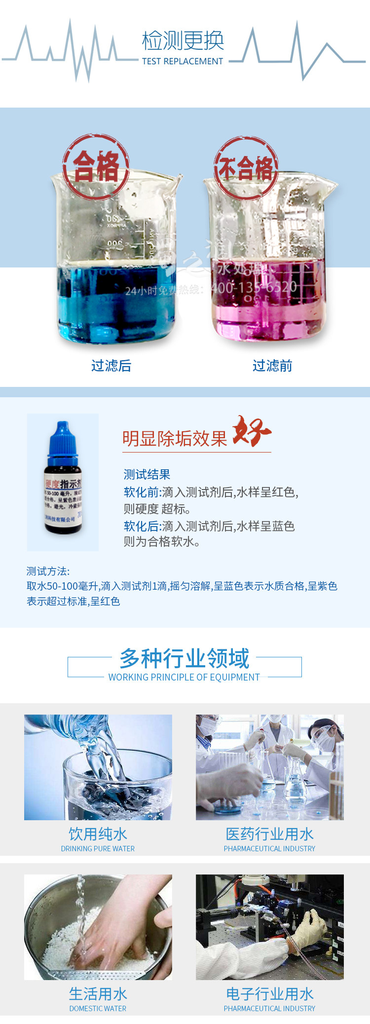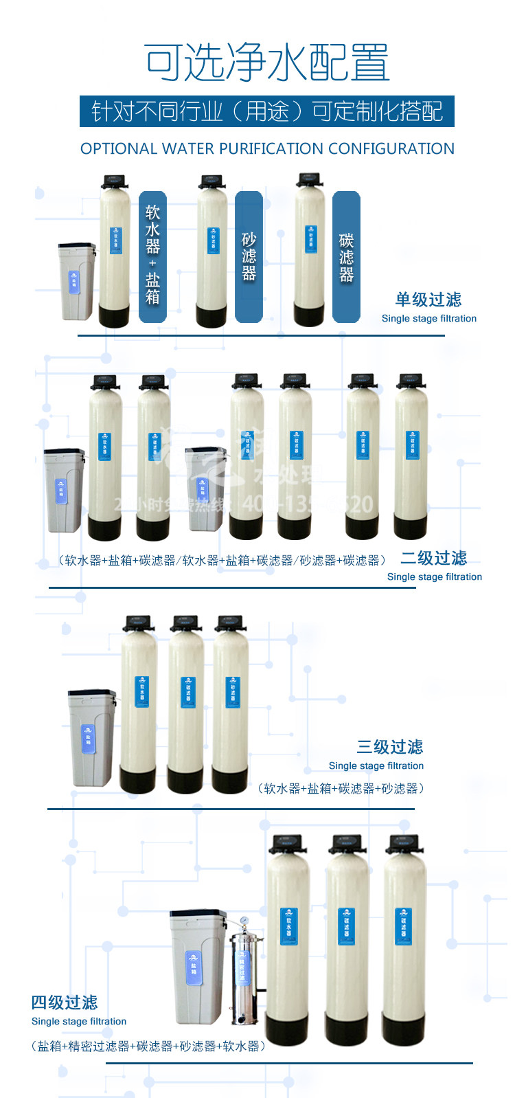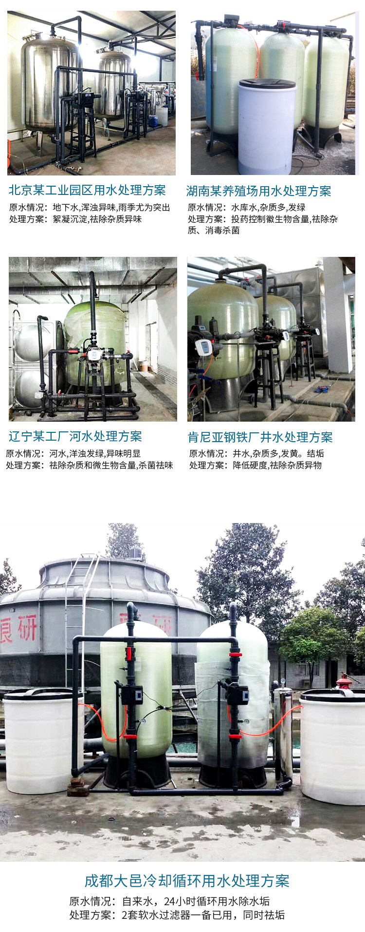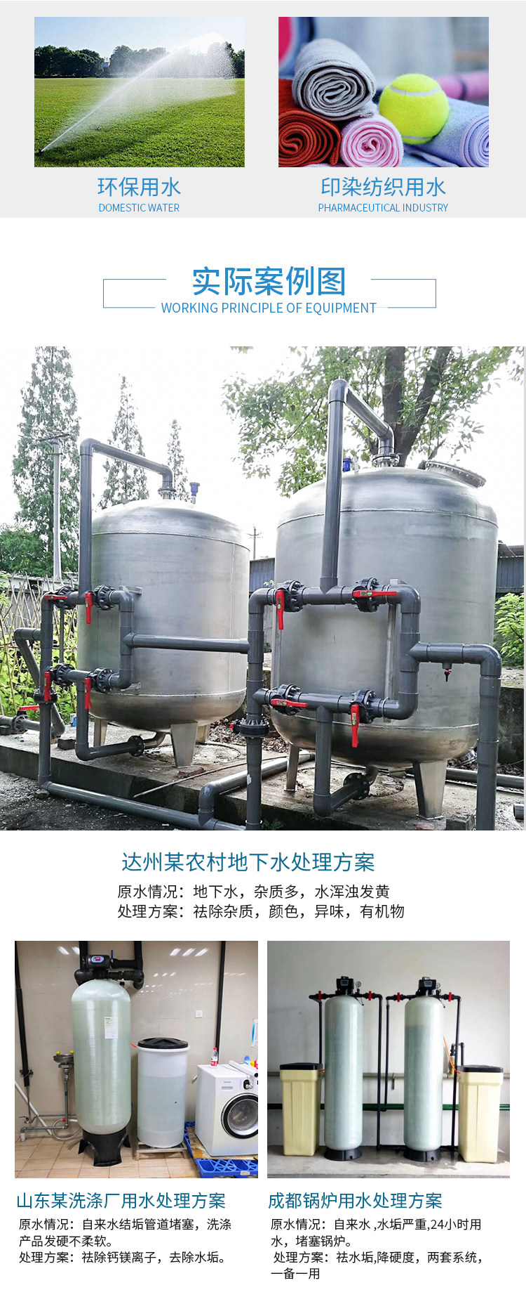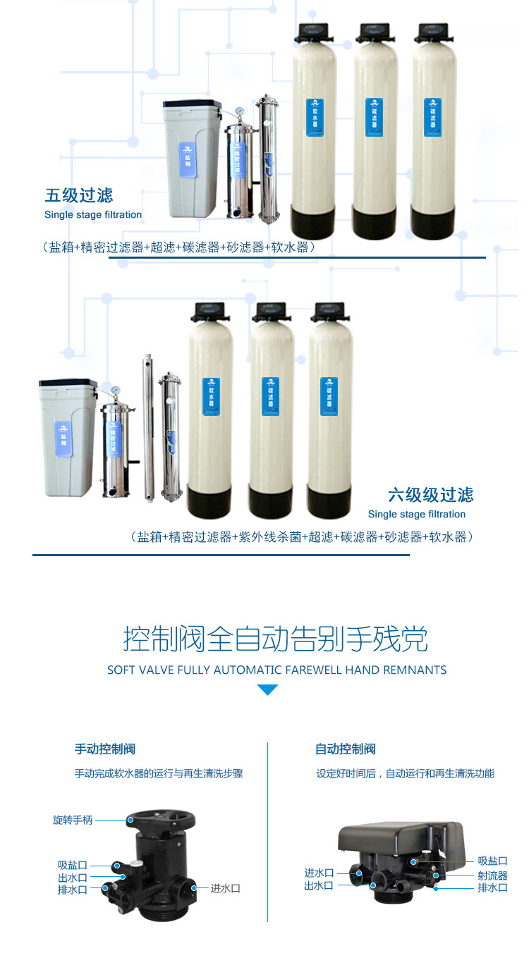 它的主要作用是去除水中钙镁离子,软化水质,降低水质硬度,当含有硬度离子的原水通过交换器内树脂层时,水中的钙、镁离子被树脂吸附,树脂吸附了钙、镁离子而钠离子进入水中,这样从交换器内流出的水就是去掉了硬度的软化水。