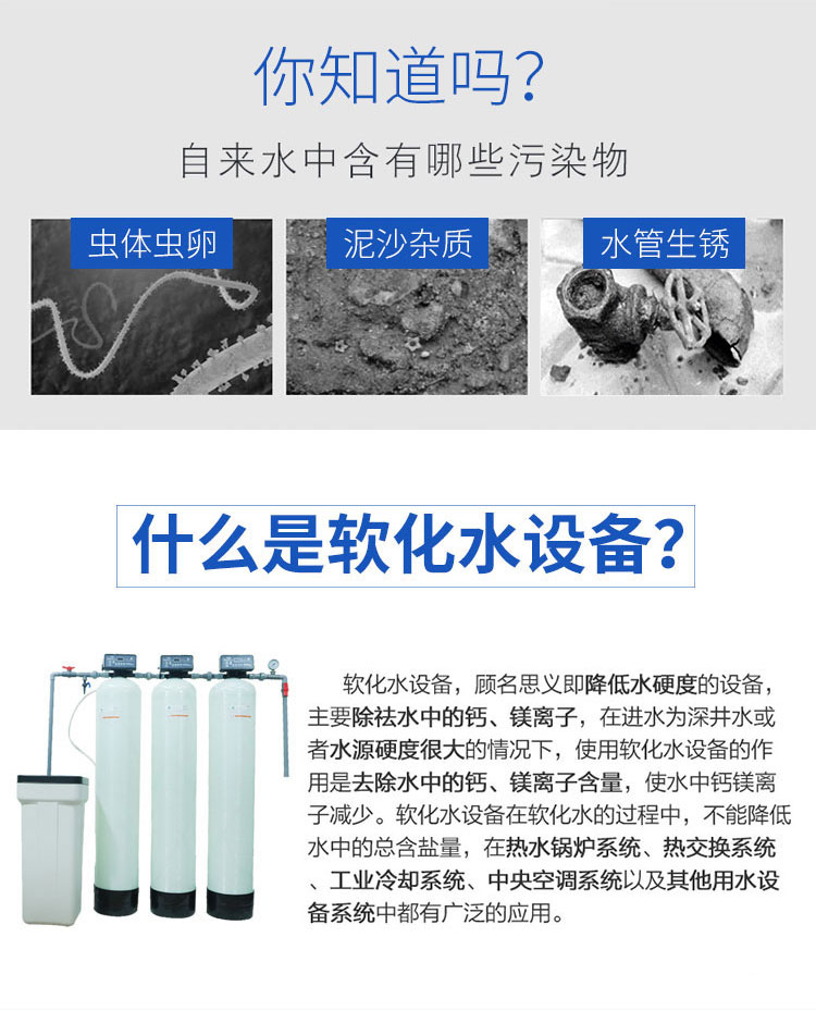软化水设备-工业软化水处理设备应用离子交换原理,去除水中钙、镁等结垢离子,使得水质软化。系统是由树脂罐盐罐(软化树脂)、控制器组成的一体化设备。 实现程序控制运行,自动再生;采用虹吸原理吸盐,自动注水化盐 、配比浓度无需盐泵、溶盐等附属设备。属于软化除盐,软化除盐设备,软化除盐机械。软化设备就是采用阳树脂对源水进行软化,主要目的是让阳树脂吸附水中的钙、镁离子(形成水垢的主要成分),降低源水的硬度,并可以进行智能化树脂再生,循环使用。