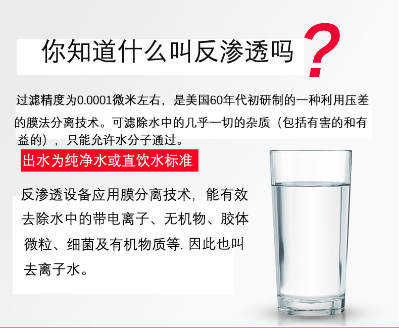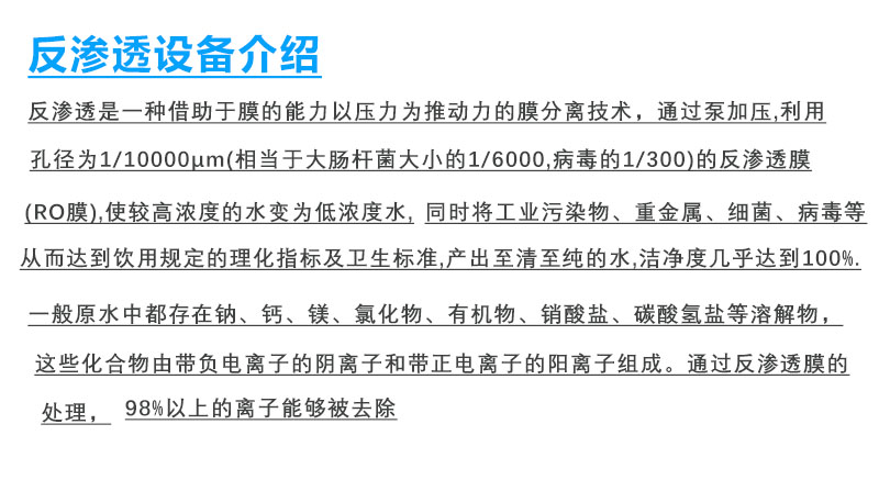 产品出水为纯净水,也就是去离子水,可以做为办公室、车间直饮水; 也可用作工业用纯水设备。全不锈钢304材质