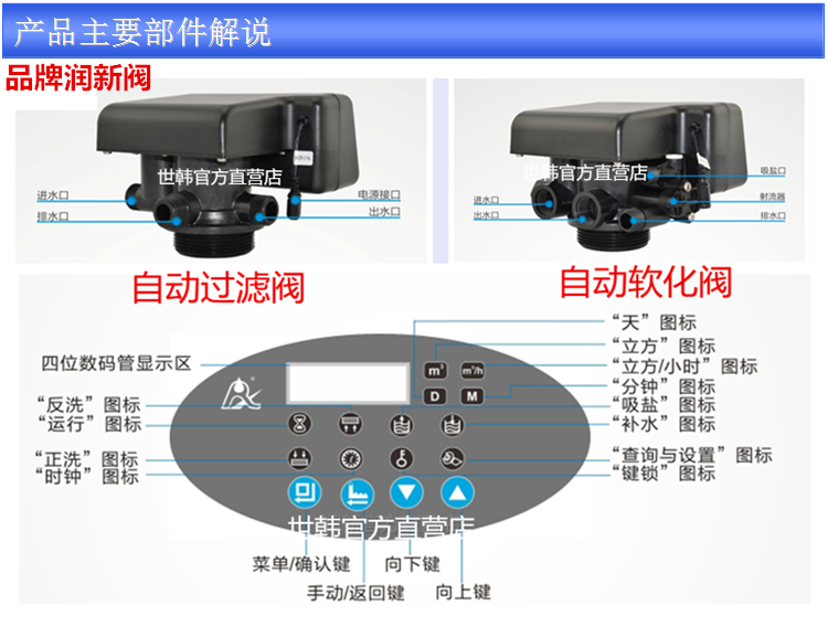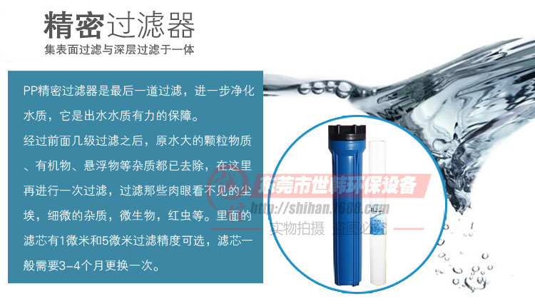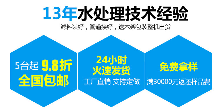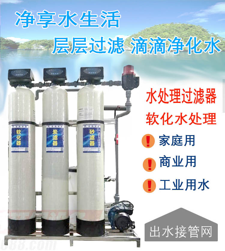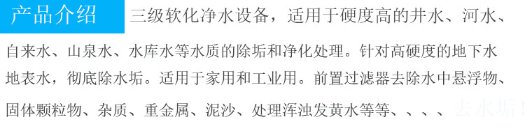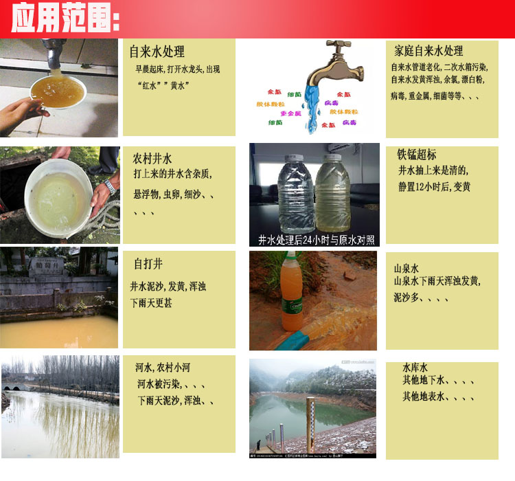 9、产品功能:过滤泥沙,杂质悬浮物等,降低原水浑浊度,去黄铁锈浑浊。除异色异味,去重金属,余氯,漂白粉等;除水垢,降低硬度,软化水质。